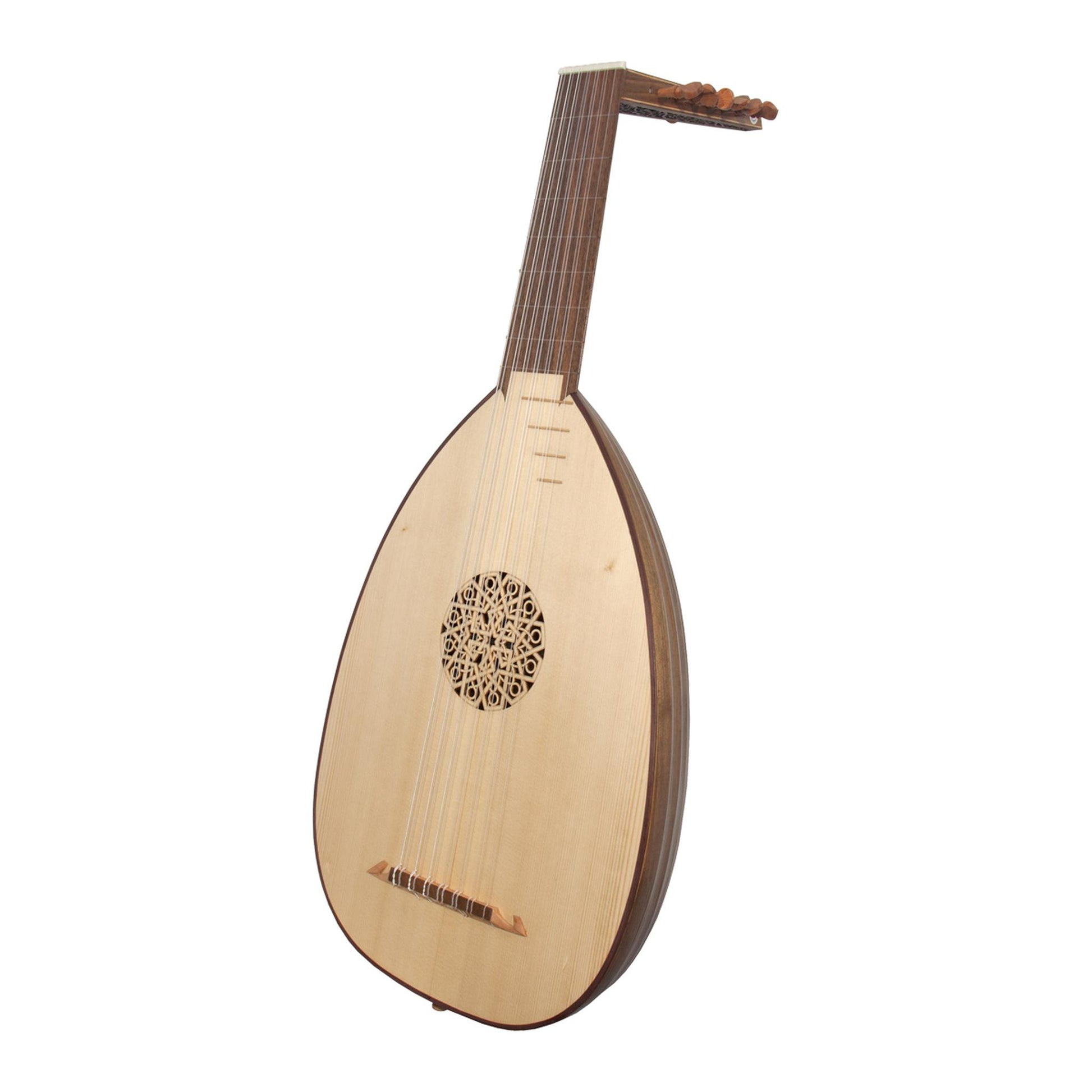 This 7 course lute features a bowl constructed of 25 fluted walnut staves. The scale length is 600 mm. Materials: The neck, bowl, nut, bridge, and end pin are walnut. The peg box is walnut and lacewood. The soundboard is spruce. A padded gig bag is included with the instrument. The, 13-string 7-course, suggested tuning is: A4, E4/E4, B3/B3, G3/G3, D4/D3, A3/A2, G3/G2.